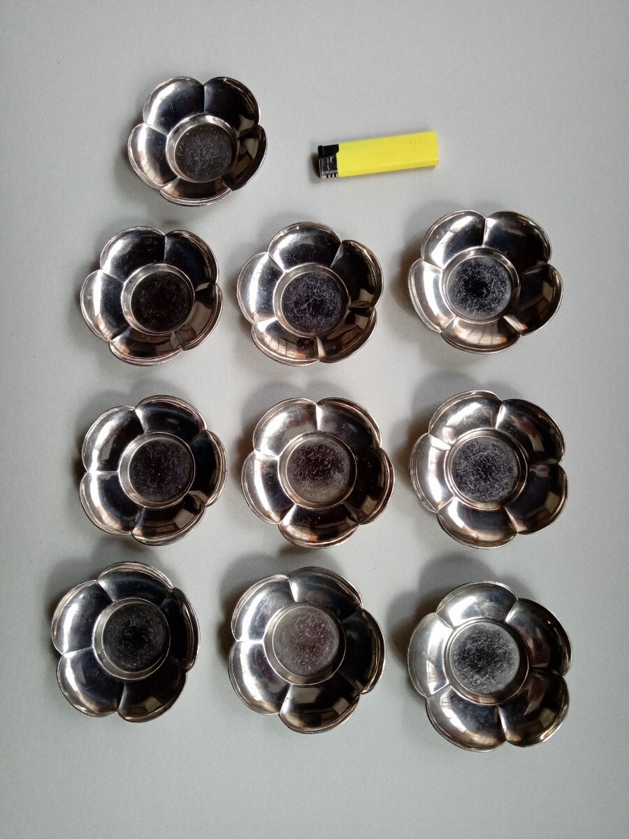 > 煎茶道具18 茶托4 乾茂自製? 梅花型10客セット 外径約9.6cm 高さ約2cm メッキ 古錫?銅製? 検索 乾茂號造 中国茶 唐物