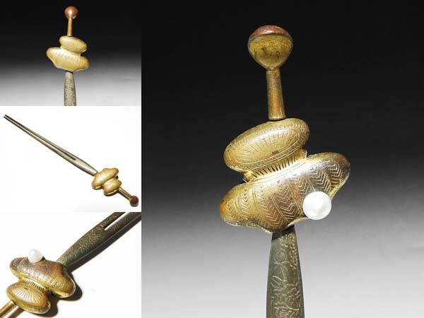 - 【桃】アンティーク髪飾り:金工純銀地鍍真珠象眼茶壺簪