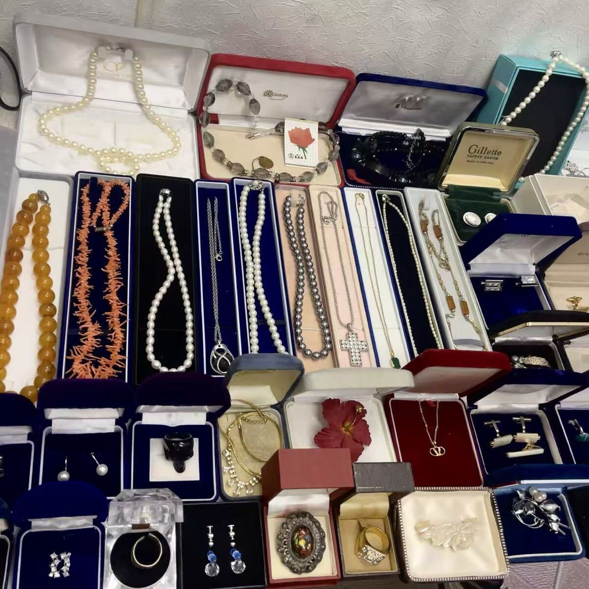 - 1円 箱付き ケース入り アクセサリー57箱まとめ 大量セット ネックレス/ブローチ/指輪/真珠/パール/珊瑚/べっ甲/天然石/CELINE/SILVER等有