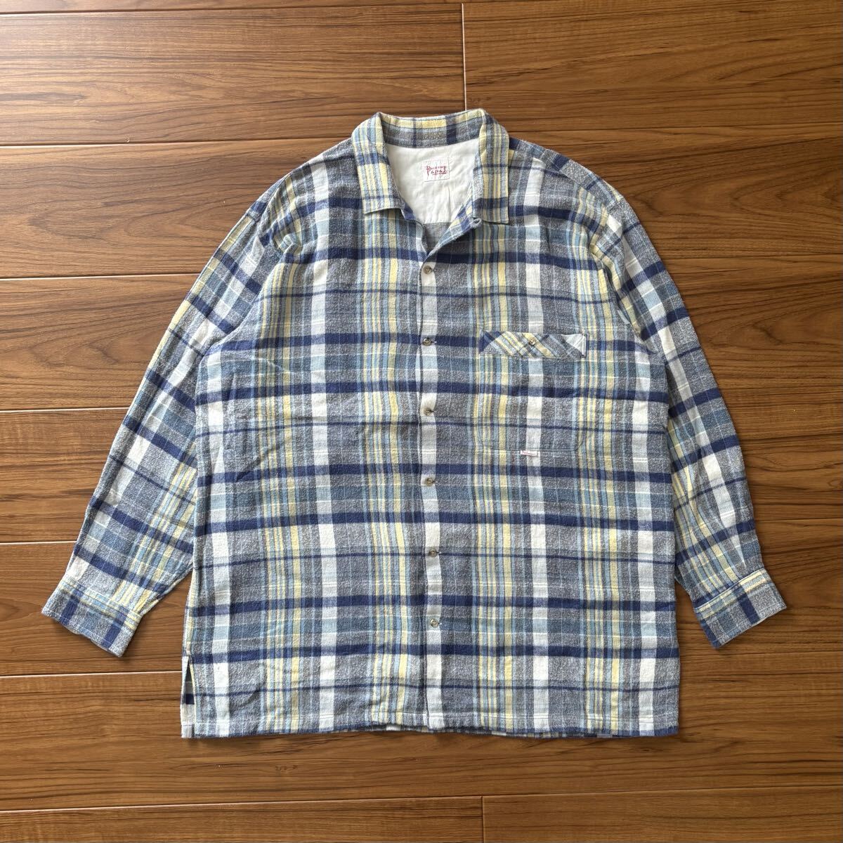 > Papas ネルシャツ チェック LL 開衿シャツ ビックサイズ 古着 日本製 パパス ブルー系 オープンカラー