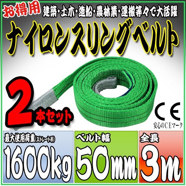 > スリングベルト2本セット 3m 幅50mm 使用荷重1600kg 1.6t 吊りベルト ベルトスリング [ナイロンスリング 吊上げ ロープ 牽引 運搬]