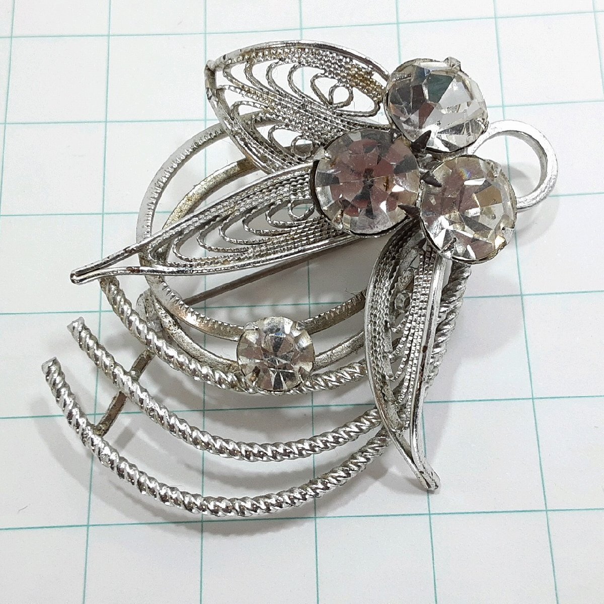 - 送料無料)ビンテージ☆クリアラインストーン お花モチーフ☆アンティーク ブローチ A32620