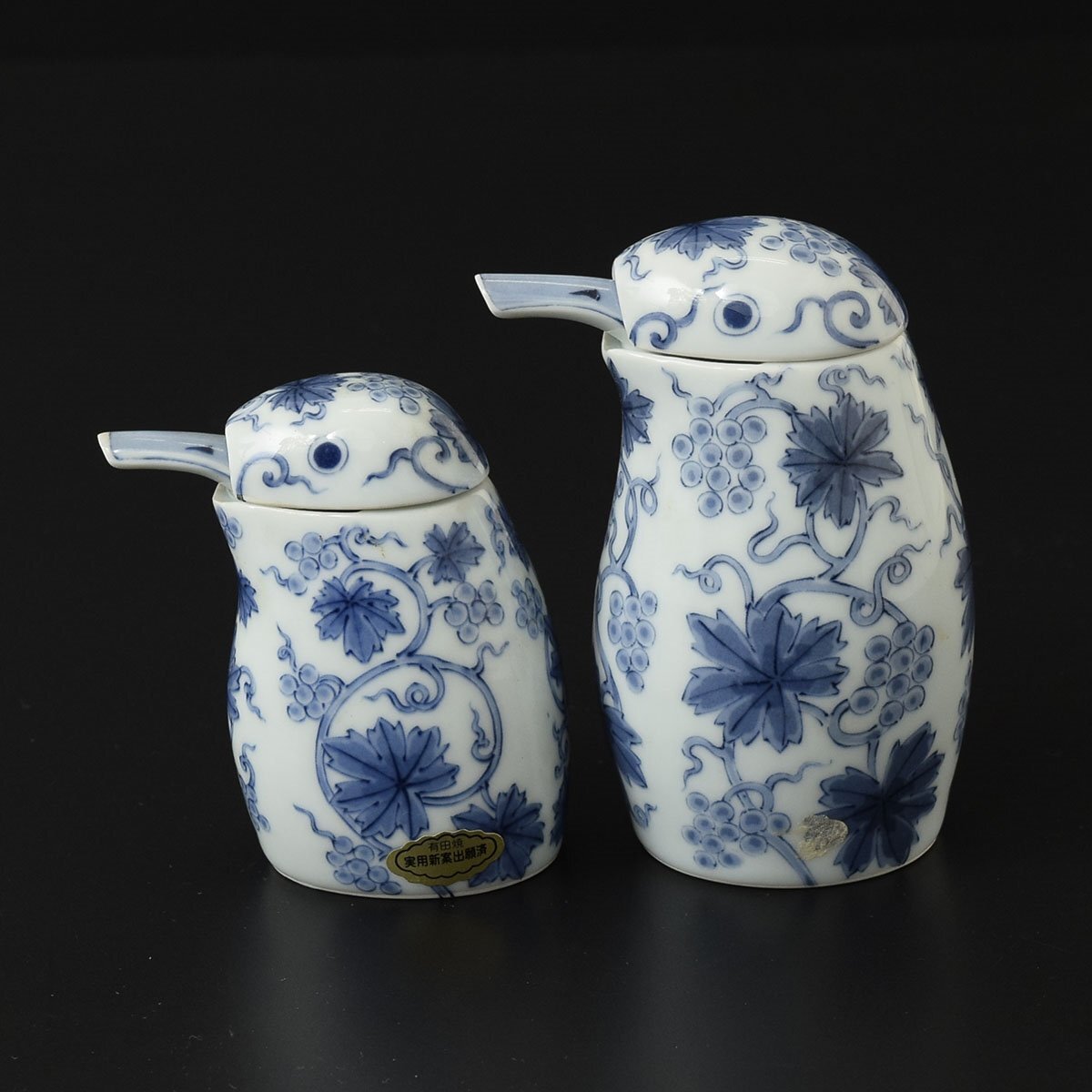 > ◎552518 美品 有田焼 幸楽窯 染付唐草川蝉形 汁次(大)(小)2点セット 醤油差し カワセミ