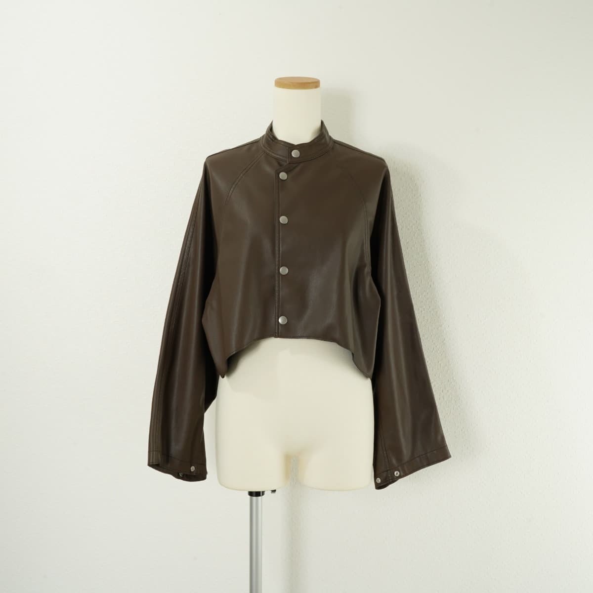 コメント:オリジナルのシンセティックレザーを使用したショートジャケット。柔らかなシンセティックレザーとラウンドした裾のデザインで丸みのある女性らしさを演出し、裾や袖口の断ち切りデザインがリメイクライクな雰囲気のデザイン。オーバーシルエットで尚且つショートの丈感はスタイルアップ効果もあります。袖口のドットボタンでシルエットを変えることができます様々なレイヤードスタイルで長い期間ご着用できるアイテムです。