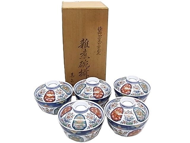 > k0583 雑煮椀揃 有田焼 其泉窯 蓋つき 茶碗 5客 どんぶり 正月 和食器 共箱