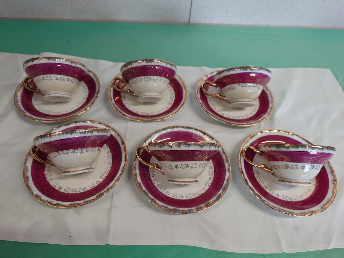 > ● アンティーク レトロ オールド ヴィンテージ レア NK China 葡萄 蔓 マーク カップ&ソーサー ワインカラーピンク 金彩 フラワー 6客 ③