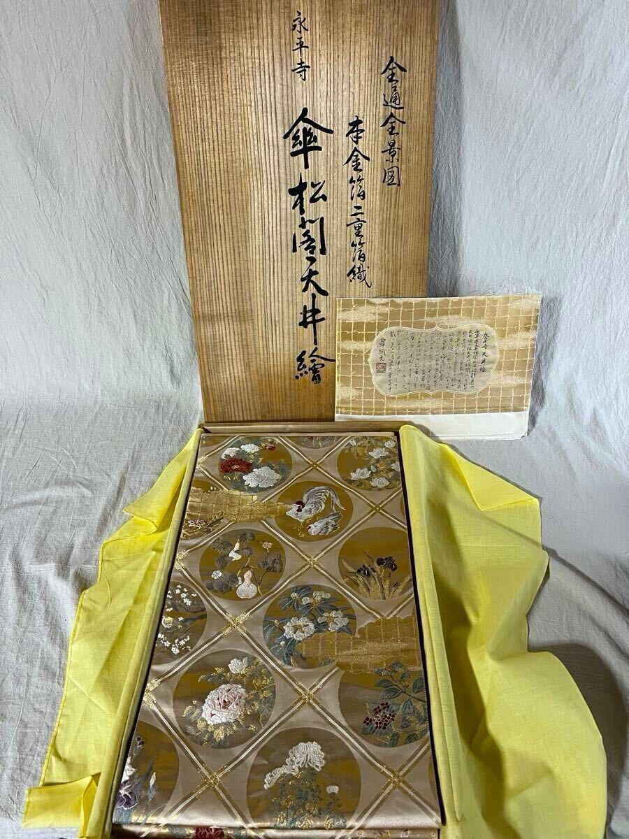 - T10-14-5 美しい 金通金景図 李金箔二重箔織 永平寺 傘松閣天井絵 袋帯 和装 着物 帯 桐箱入 西陣織 正絹