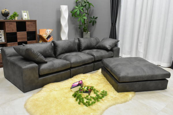 新素材レザーファブリック張りスツール付き3人掛けソファー ダークグレイ