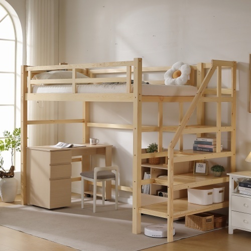 - ロフトベッド 階段付き 天然木 コンセント付き シングル 宮付き 収納棚付き 収納 北欧風 大人 一人暮らし 子供ベッド ベッド 高さ1 KU536