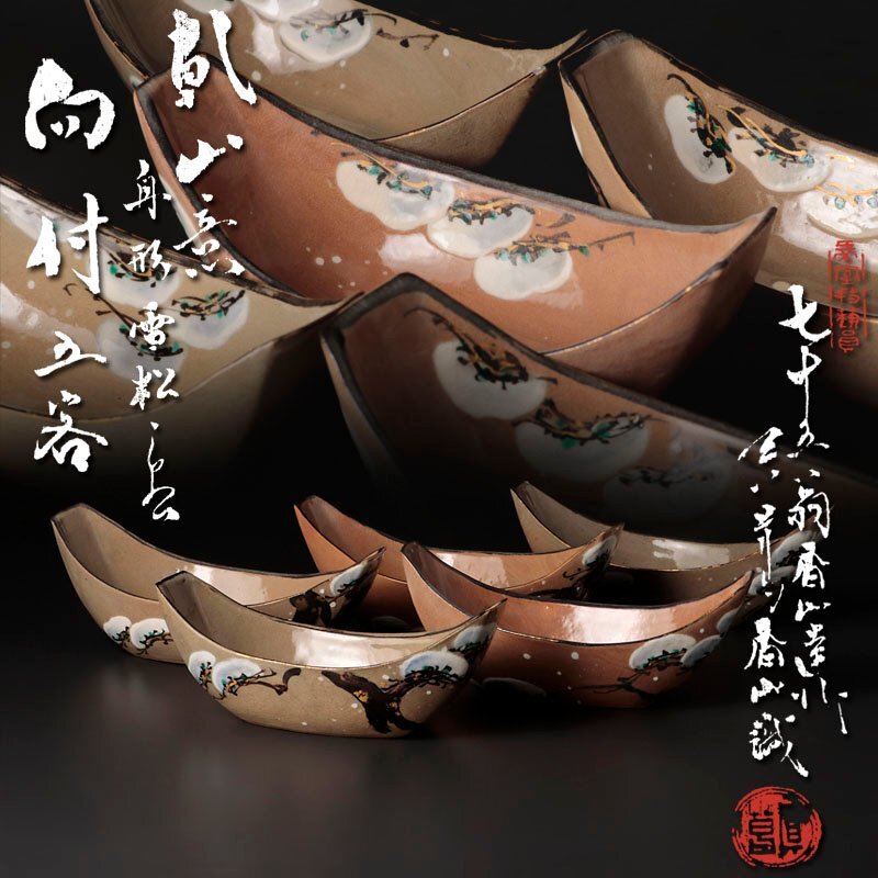- 【古美味】初代真葛香山作 二代真葛香山識 乾山意 舟形雪松 向付 五客 茶道具 保証品 QCc5