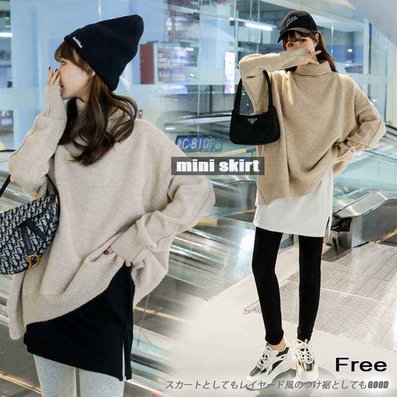 > レディース ミニスカート ニット ボトムス スリット つけ裾 レイヤード ウエストゴム ビッグ(2XL) ホワイト