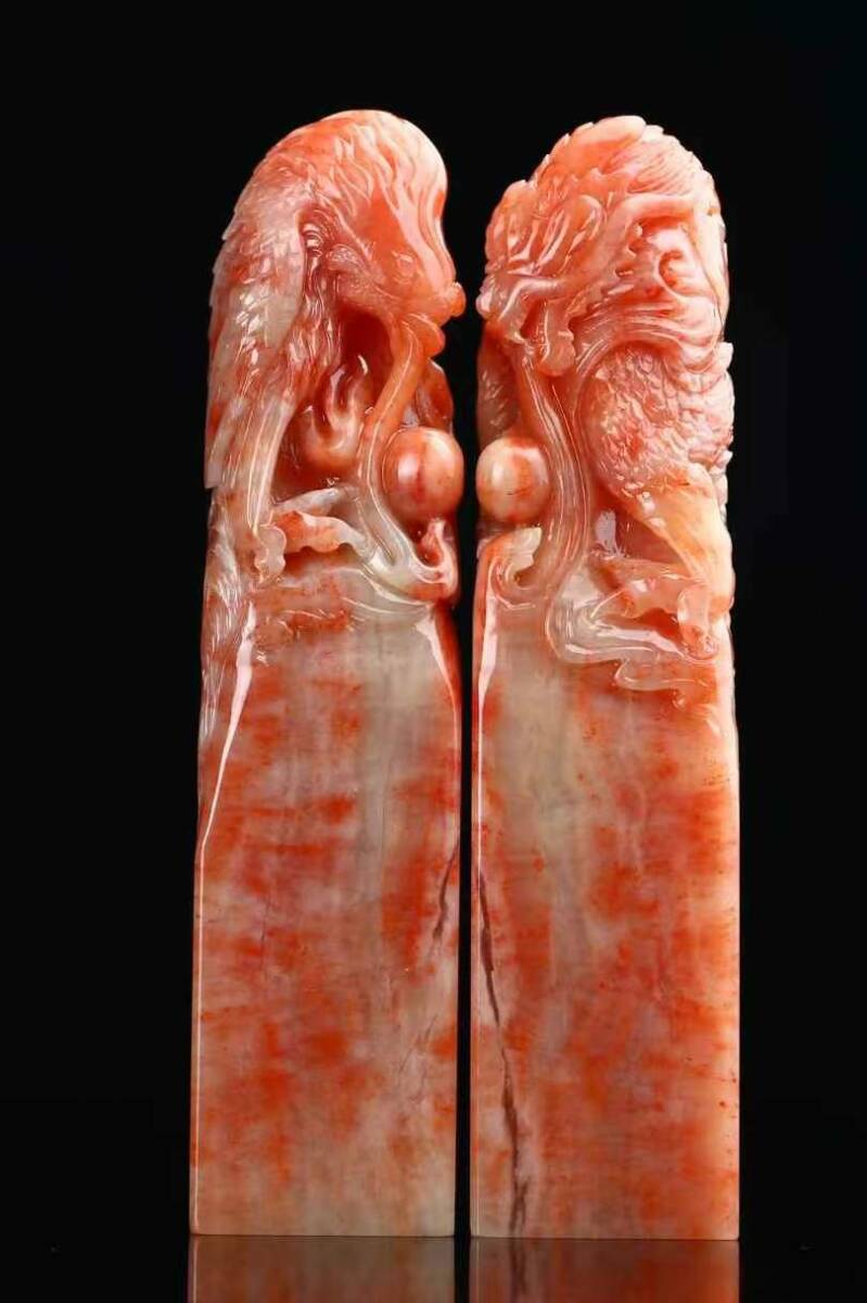 - ◆珍蔵◆中国古美術 古寿山石芙蓉石彫り 龍鳳呈祥對章 精品 2点 箱付 細密細工造 置物 擺件 古賞物 骨董品 時代物 A68