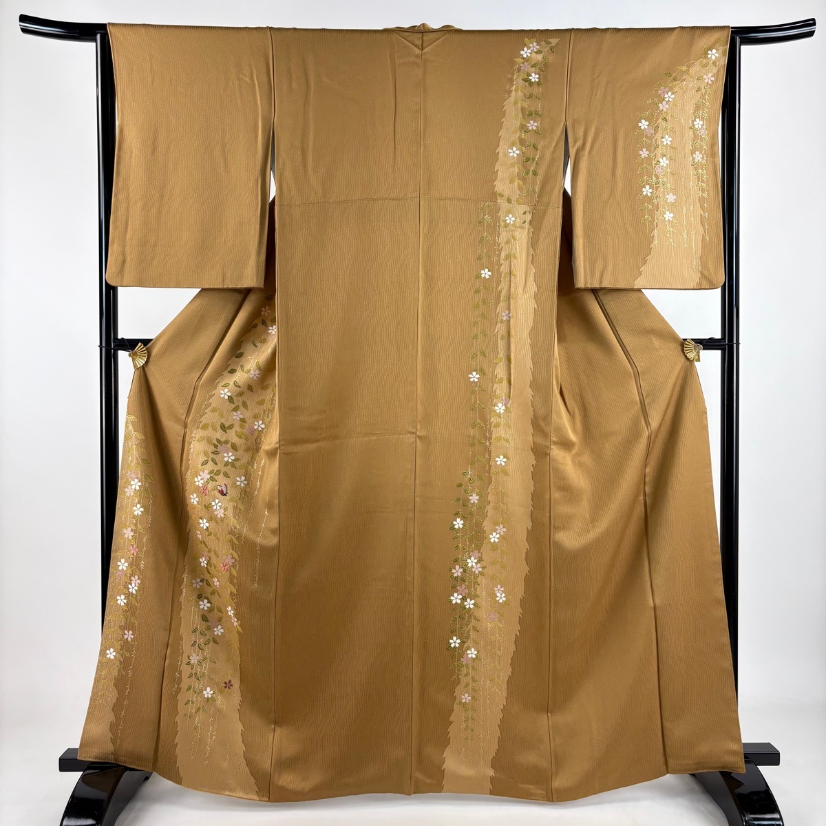 - 【美品】 訪問着 身丈163cm 裄丈63cm S 袷 枝垂れ桜 蝶 金糸 刺繍 黄土色 正絹 秀品 【中古】