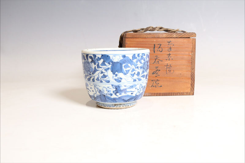 - 中国美術 青花童子花卉紋碗 南京焼湯呑茶碗 時代箱附 (P137)