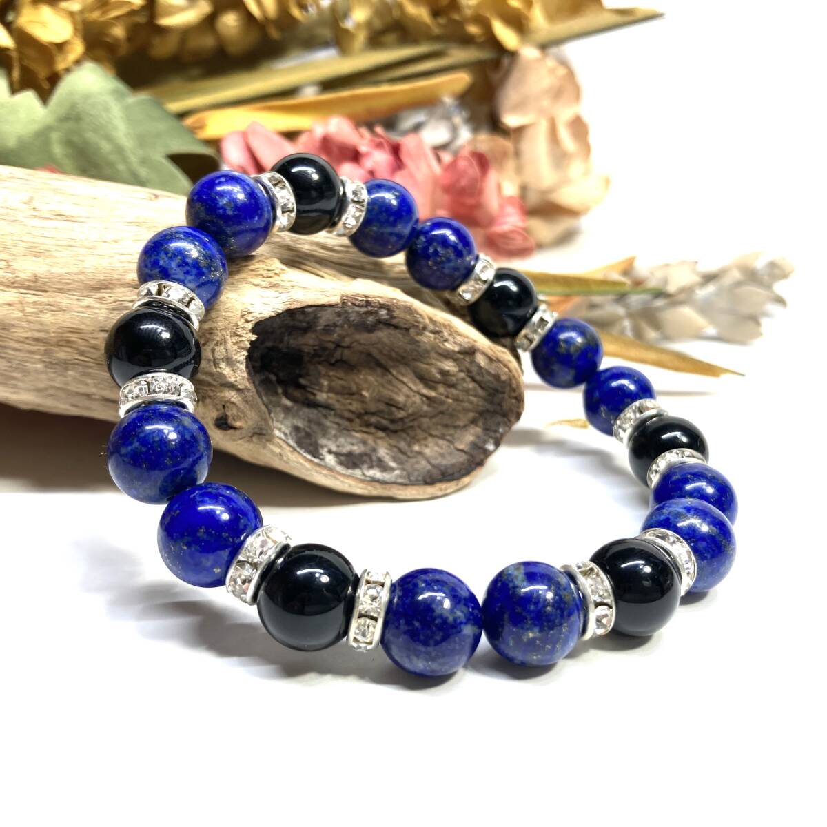 > ラピスラズリ&オニキス パワーストーン ブレスレット 天然石ブレス (シルバー) 10mm メンズ・レディース 幸運 仕事運 学業運 ☆