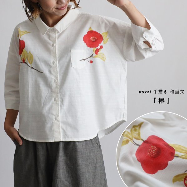 - 日曜日終了 1000円からスタート 要確認 ギマ擬麻コットン 手描き 角襟 燕尾裾 幅広 オーバー シャツ ジャケット 前開き 花 椿F77◎要