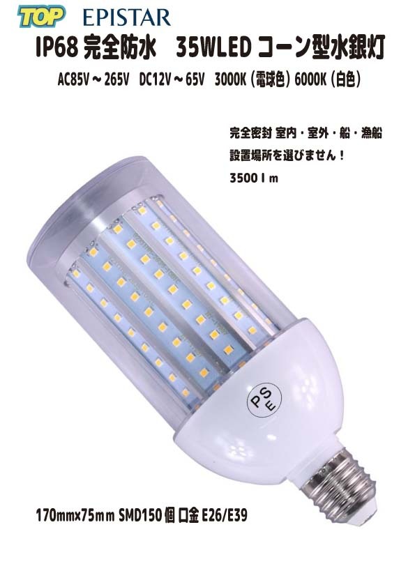 - IP68完全防水! 室内・室外兼用 LED水銀灯 35W E26 3000K 3500lm DC12V~65V 船・漁船・クルーザー・倉庫・ガレージ・養鶏場・養豚場