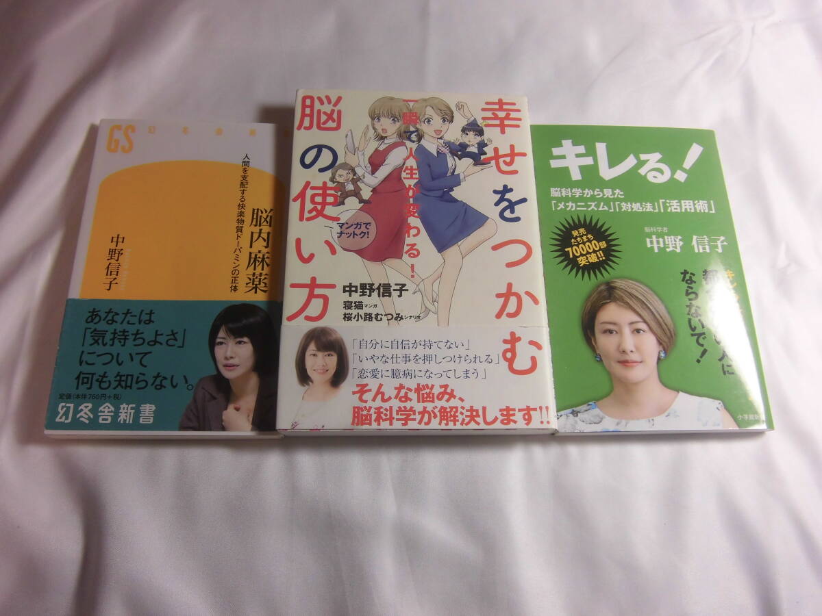 「一瞬で人生が変わる! 幸せをつかむ脳の使い方」 中野 信子 (著) 2016年初版定価1300円+税。と「キレる!: 脳科学から見たメカニズム対処法活用術」中野 信子 (著) 2019年初版2019年3刷定価780円+税。と「脳内麻薬 人間を支配する快楽物質ドーパミンの正体」 中野 信子 (著) 2014年初版2015年14刷定価760円+税の計3冊セット。