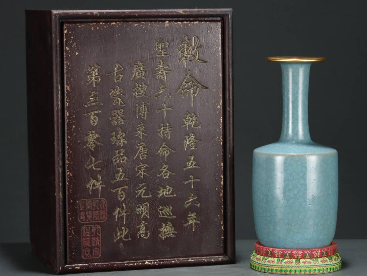 - ▽鴻▽宋朝時代 陶磁器 汝窯氷裂窯氷包金口紙槌瓶 時代木箱付き 染付 時代物 中国古美術 骨董品