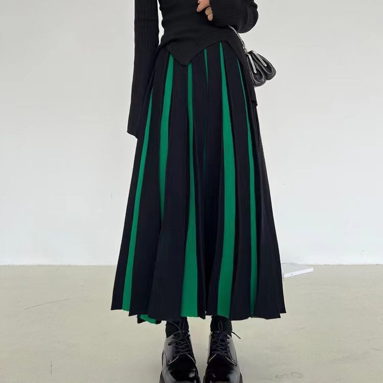 - プリーツスカート ロング丈 ニット 秋冬 レディース ストライプ Aライン バイカラー ニット 2color切り替え 体型カバー グリーン