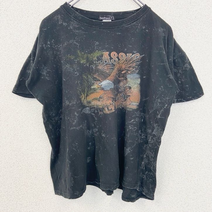 > 古着 used boohoo 半袖アニマルプリントTシャツ イーグル 鷹 レトロデザイン クルーネック 黒 ブラック
