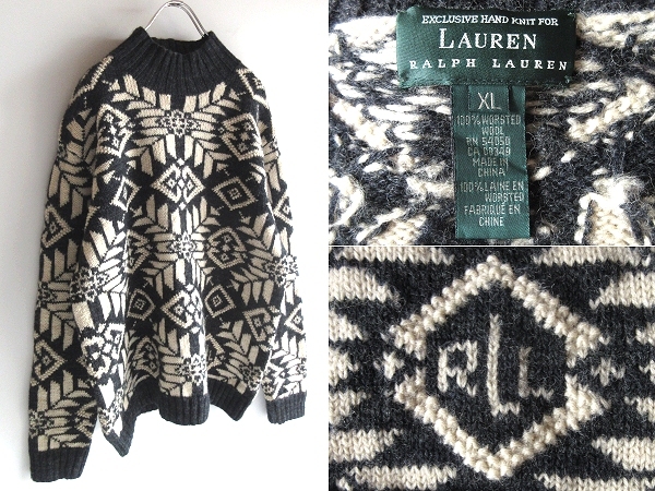 - 希少 90sビンテージ RALPH LAUREN ラルフローレン HAND KNIT ロゴ/ネイティブ柄 肉厚 ウール ハイネックニット ハンドニット XL USA企画