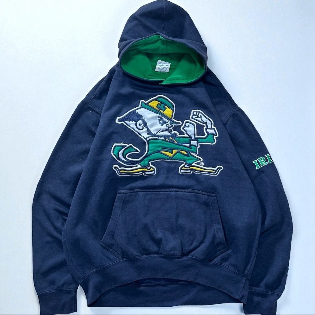 > 人気!カレッジ刺繍スウェットパーカー ノートルダム大学 ファイティング・アイリッシュ レプラコーン ネイビー メンズ M 古着 / A2570