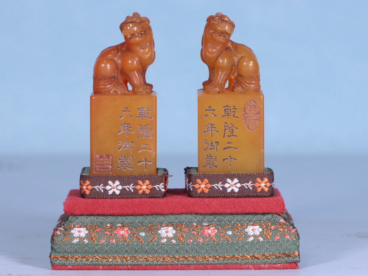 - ▽鴻▽清時代 乾隆二十六年御製 寿山田黄石彫 瑞獣鈕印章一対 印鑑 共箱 時代物 中国古美術 骨董品