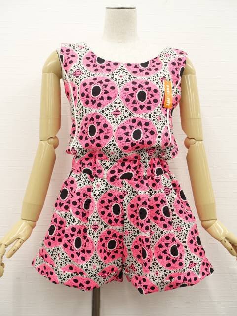 - 80%OFF 定価\12,800 新品タグ付 S-lairy 洗えるノースリーブキュロットワンピース 2 ホワイト地 ピンク×ブラック ハート柄 【メール便可】