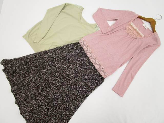 > 美品 r.p.s等 長袖カットソー2点+ロングフレアスカート コーデ3点セット M相当 ピンク地 花/緑/黒地 花柄 ガーリー・フェミニン系 20代~