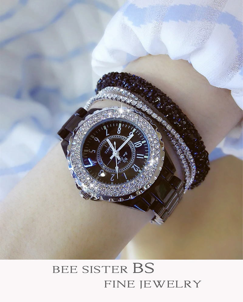 - ジルコニア ダイヤモンドきらきら●ブラックセラミック レディース腕時計 クォーツ