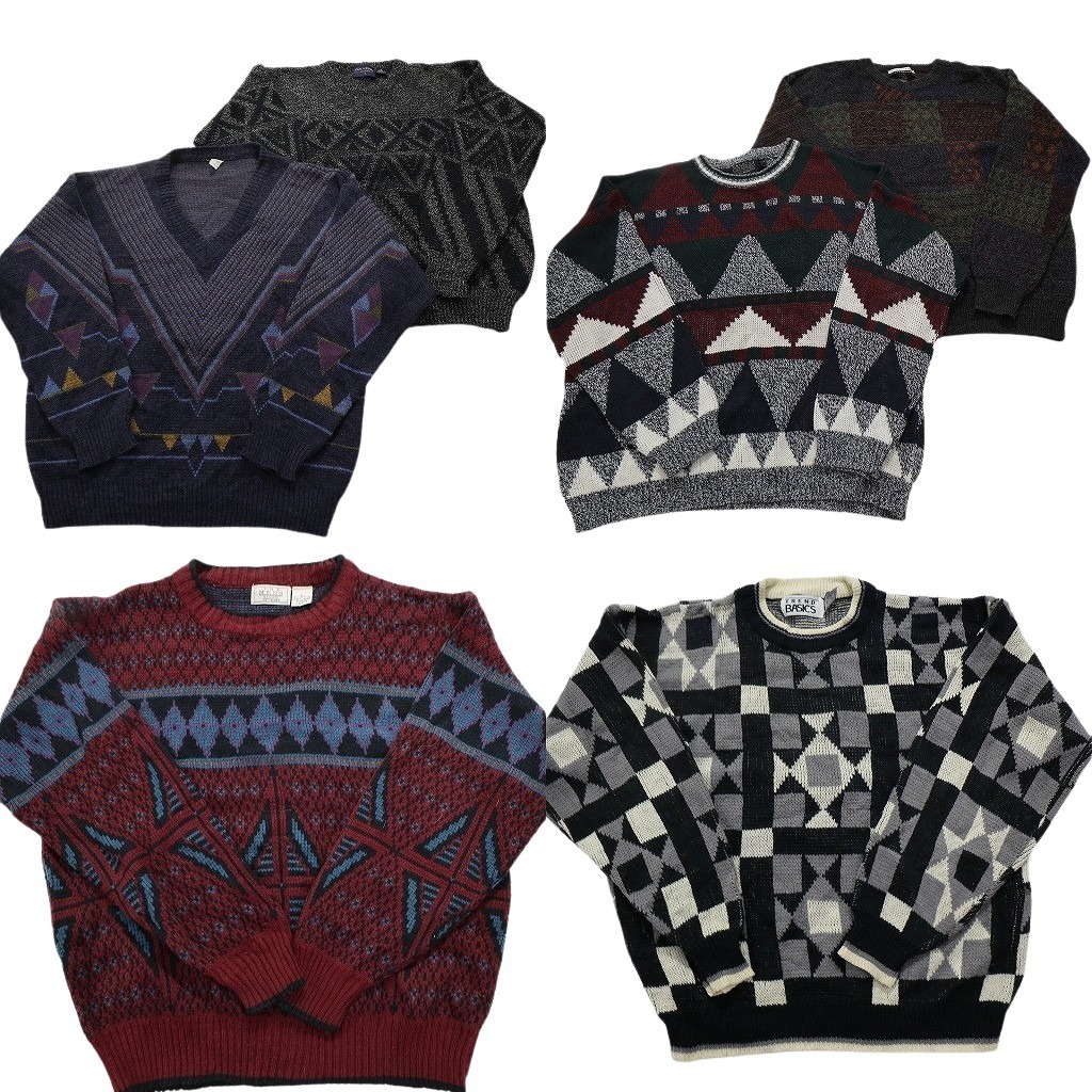 > 古着卸 まとめ売り 総柄ニット セーター 6枚セット (メンズ L ) Vネック クルーネック 幾何学模様 モノトーン 中古 古着 NC3490