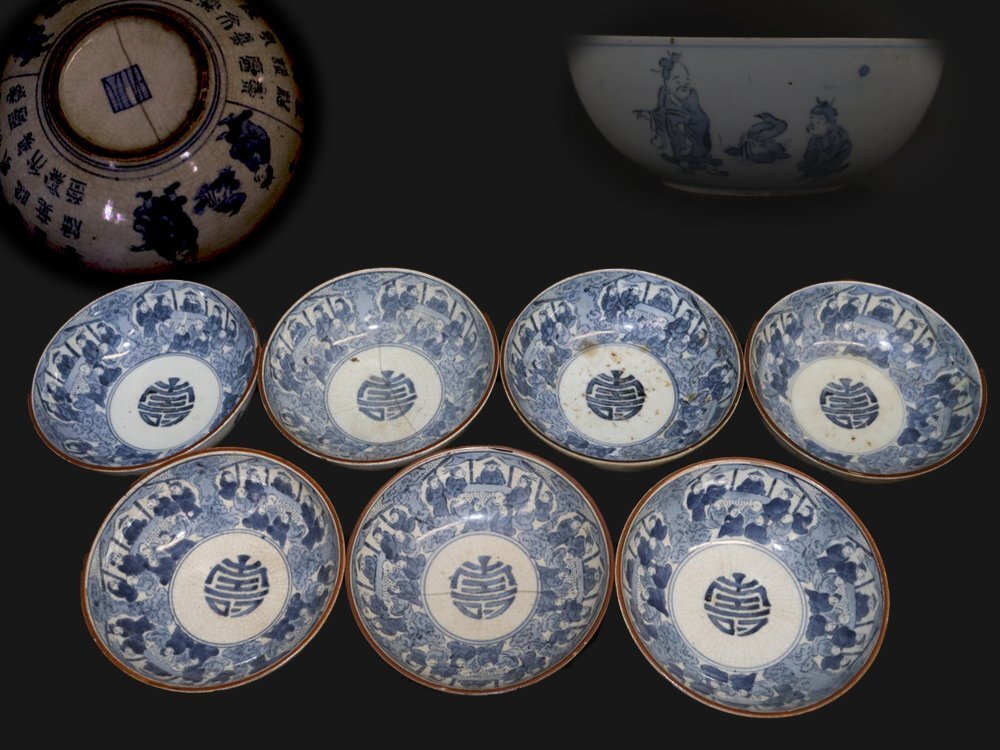 - 【江】中国古玩 染付人物漢詩壽文鉢 7客 直径14.2cm 古美術品(中皿菓子皿銘々皿懐石料理道具)CX506 LTfdrt
