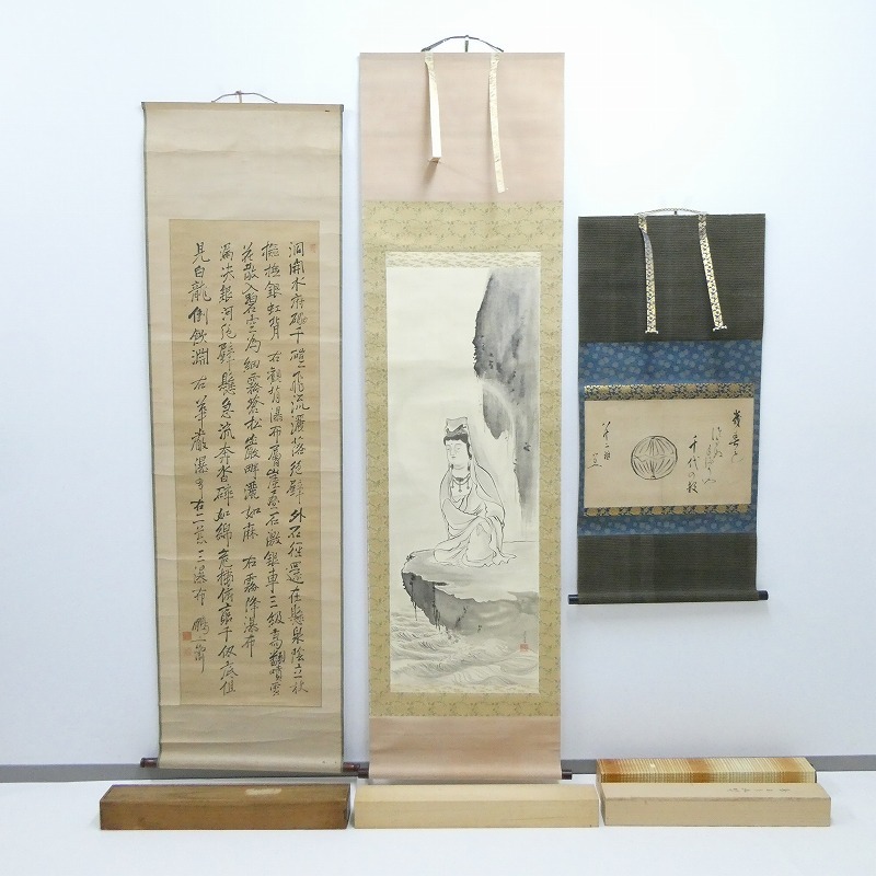 - 2510-0052●宝市【引取★大歓迎】孤峰不白筆跡/手まり画賛/亀田鵬斎/五行書/詩詠/華厳の滝/アサ子/観音/掛軸/3点組/共箱付(梱包サイズ120)
