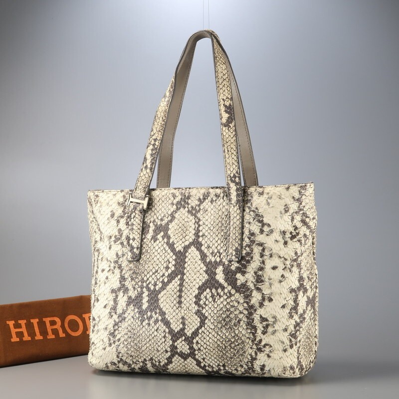 - MI1945■イタリア製 HIROFU ヒロフ パイソンレザー 本ヘビ革 トートバッグ 肩掛け 鞄 Hロゴ装飾 ライトベージュ/グレー系
