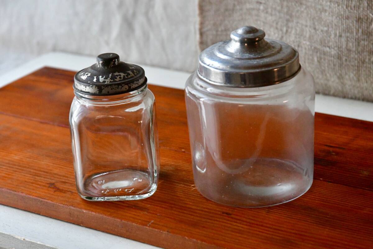 - 丸型は底径9cm&アルミ蓋 小さな古いガラス瓶形違い2種 ミニ角型はやや現代物&サビサビブリキ蓋 飴容れ駄菓子屋古民家おうちカフェ雑貨