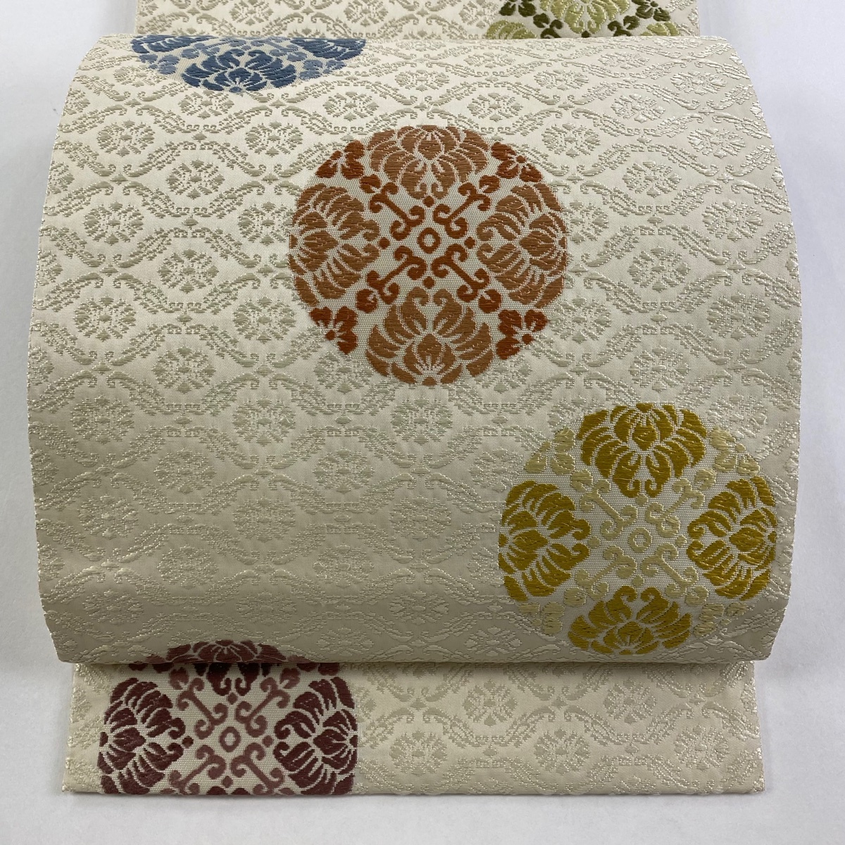 - 袋帯 名品 丸紋 花唐草 唐織 クリーム 六通 正絹 【中古】