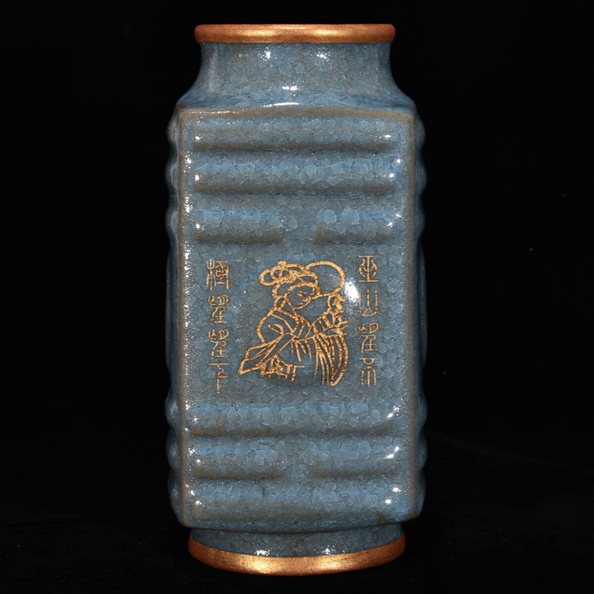 > A_YF0928【惠】人間国宝 中国骨董 陶芸 磁器【宋汝窯藍釉氷割れ包口銘文刻女性人物茶瓶】工芸品 施釉陶 青花磁 陶芸 置物 收藏品