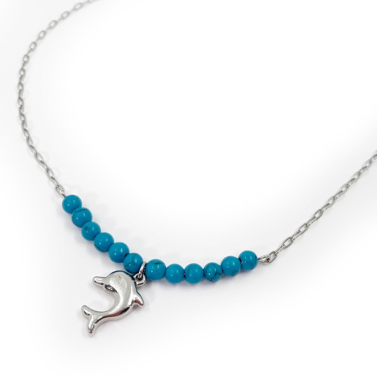 - ステンレスパワーストーン ネックレス 全長約45cm BN62 ターコイズ&いるか イルカチャーム