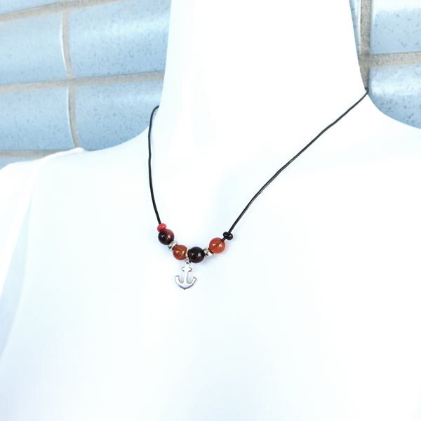 - 革紐細めネックレス チョーカー ミニマリンチャーム ステンレス金具 カーネリアンレッドタイガーアイ BN11