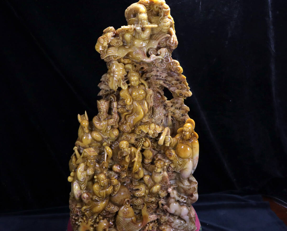 - ▽鴻▽清朝時代 寿山石 金包銀田黄石彫 八仙過海紋巨大置物 箱付 時代物 中国古美術 骨董品