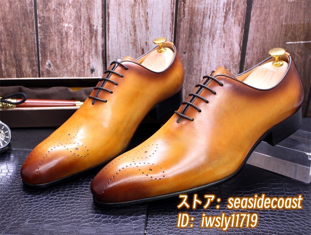 - 定価11万★超希少 ビジネスシューズ メンズ 職人手塗仕上げ 彫り 本革レザーシューズ 最高級 紳士靴 フォーマル 革靴 牛革 イエロー 25.5cm
