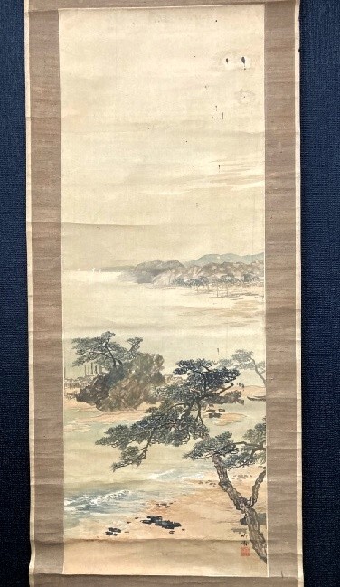 - 【模写】山下竹斎「海辺松風山水図」絹本箱付 山元春挙師事 京都の人 検)掛け軸/日本画/南画/風景/文人画/四条派 /書画/水墨