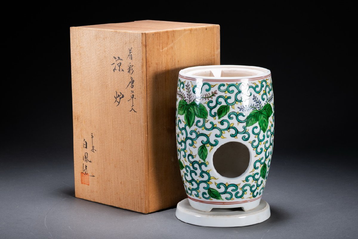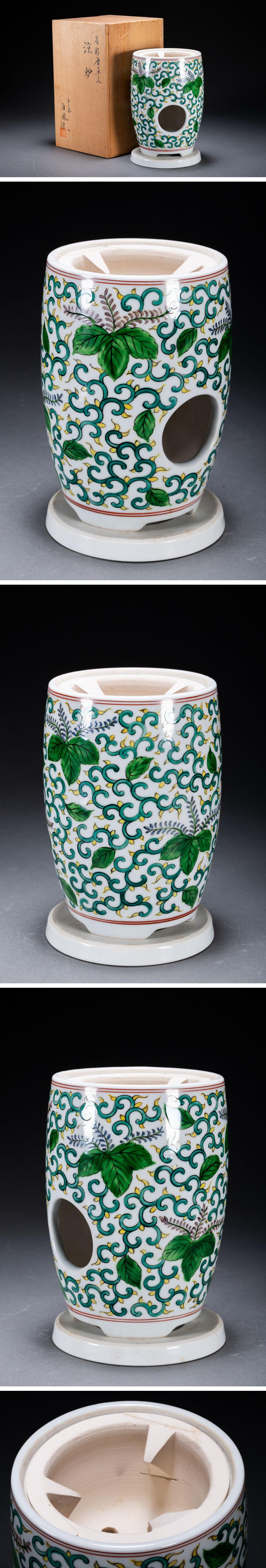 > 【清】某有名オークション購入 時代物 平安白鳳造 色絵唐草紋涼炉 傷あり 共箱 古置物 古擺件 古美術 時代コレクション7L10-11S2