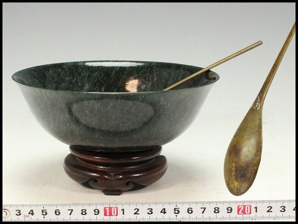 - 【金閣】中国美術 壁玉 碗 台 匙付 時代物 旧家蔵出 送料無料(A385)