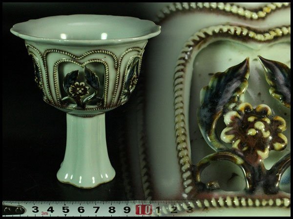 - 【金閣】中国美術 貼枝花 高碗 旧家蔵出 送料無料(A728)