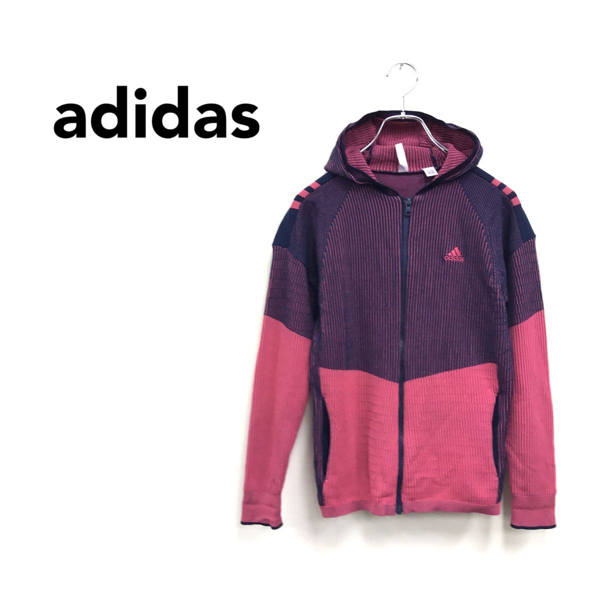 > 2O2386-G-N◆ adidas アディダス ジップアップニットフーディ パーカー ストライプ ストレッチ ◆ sizeL ピンク ネイビー ナイロン