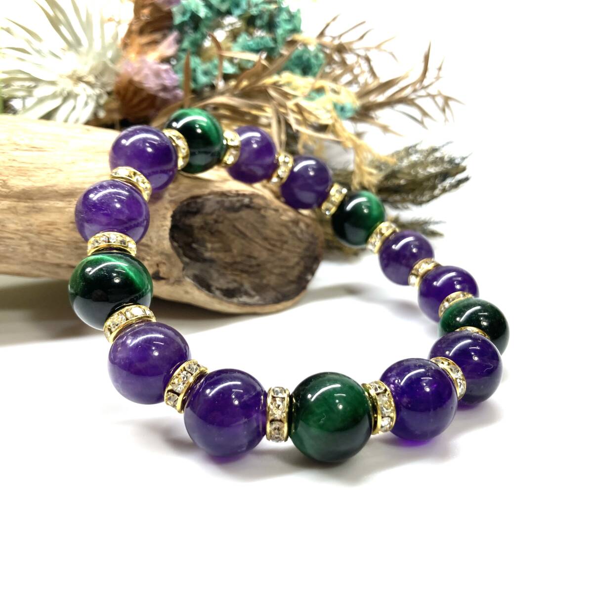 > グリーンタイガーアイ&アメジスト パワーストーン ブレスレット 天然石ブレス (ゴールド) 12mm 金運 仕事運 メンズ・レディース 男性 女性