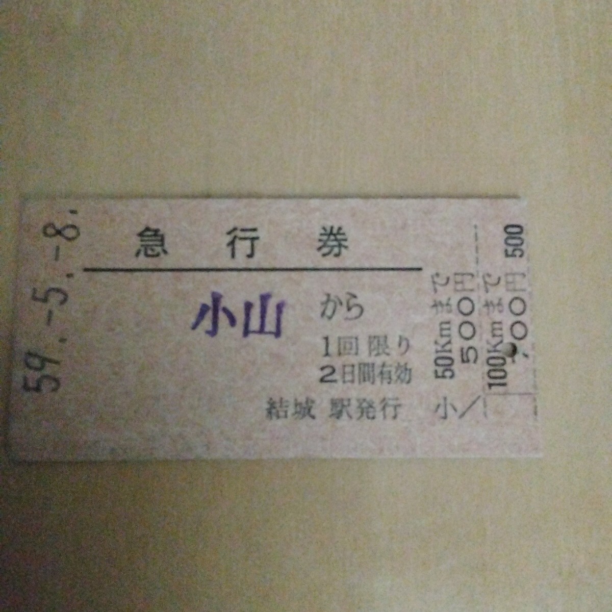 - 急行券小山から50キロまで昭和59年5月8日、国鉄、硬券