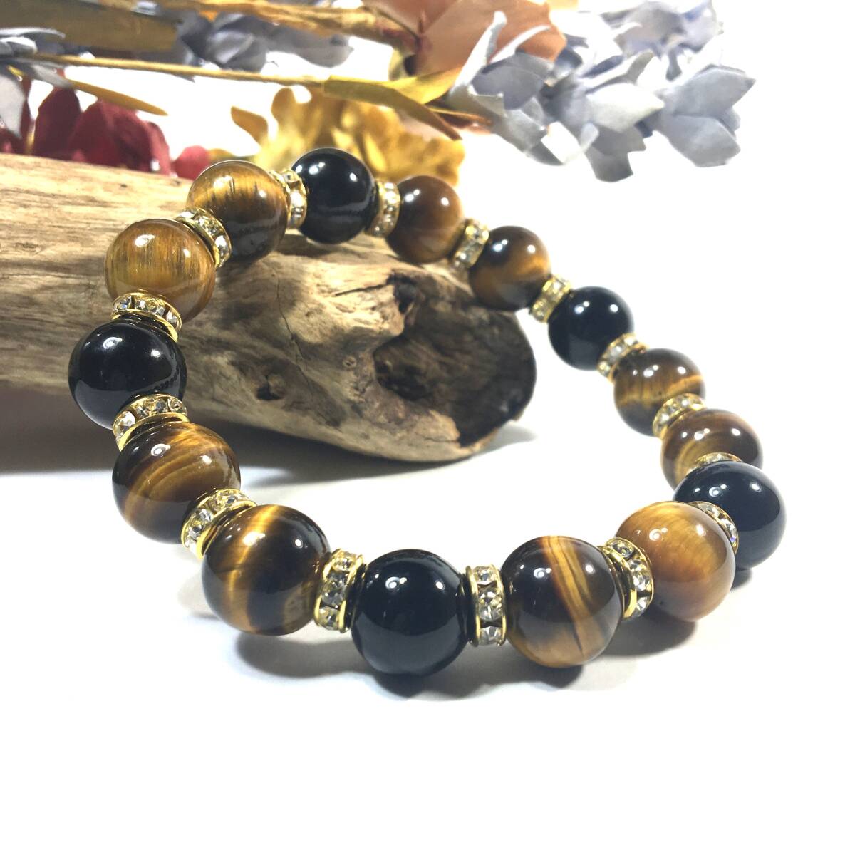 - タイガーアイ&オニキス パワーストーン ブレスレット 天然石ブレス (ゴールド) 12mm 幸運 開運 メンズ 男性♪